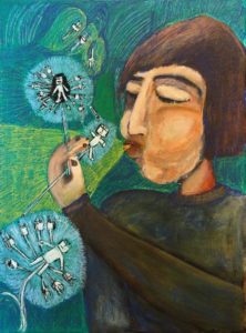 gondolatokat szimbolizáló figurák vissza-vissza köszönnek vásznain, tükrözve a kapcsolatok